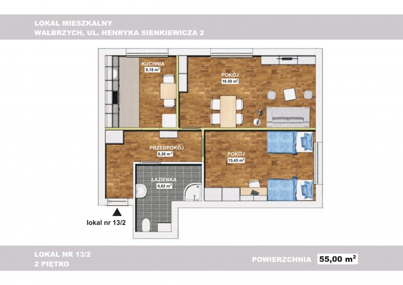 Standard mieszkania: Mieszkanie (2 pokojowe z oddzielną kuchnią) zostało wykończone i wyposażone w estetyczne i odpowiadające standardom umeblowanie przeznaczone do zamieszkania, odpoczynku i pracy, w sprzęt RTV, sprzęt AGD do aneksu kuchennego tj.: zlewozmywak, płytę grzewczą, lodówkę, zmywarkę, piekarnik, pochłaniacz, dodatkowo akcesoria oświetleniowe, rolety okienne. Łazienka wyposażona w: kabinę prysznicową, umywalkę z szafką, WC, pralkę. Pokoje wykończone zostały panelami podłogowymi. Aneks kuchenny oraz łazienka wykończone płytkami.